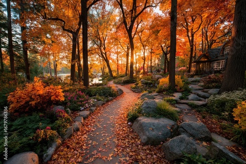 © ryandi, Obraz premium Autumnal path through a vibrant park
