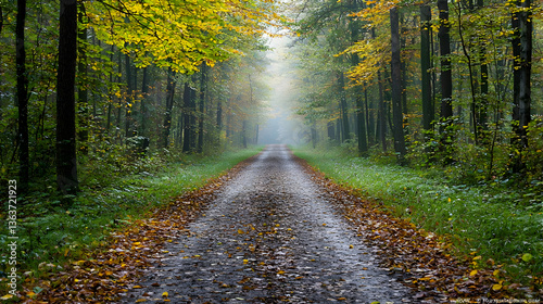 © artzone, Fototapeta premium Autumnal Path Through Foggy Forest