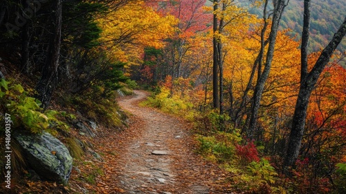 © navisatul, Obraz premium Autumnal path winding through colorful mountain forest.