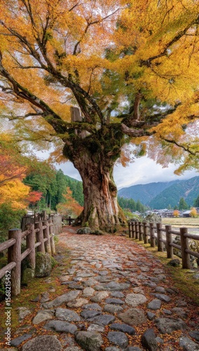 Naklejka premium Autumnal path winds through a Japanese village, beneath a magnificent,...