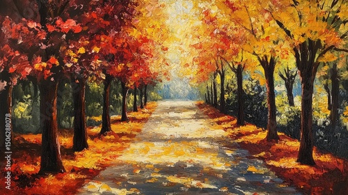 © Masjid, Naklejka premium Autumnal Pathway: A Vivid Oil Painting of a Sunlit Road Through Colorful Trees