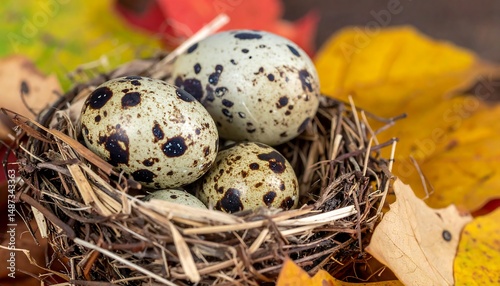© Ariep, Obraz premium Autumnal Quail Eggs Nestled in Nature's Embrace