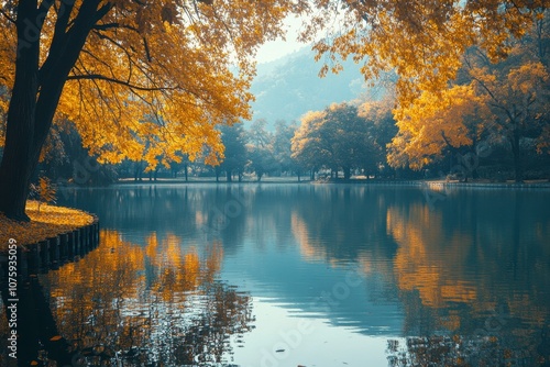 © Mr. Muzammil, Naklejka premium Autumnal Reflections on a Still Lake
