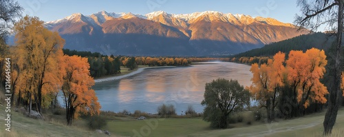 © tukang, Fototapeta premium Autumnal River Landscape: Majestic Mountains and Golden Trees