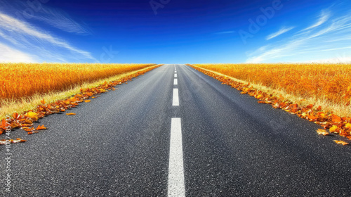 Fototapeta premium Autumnal Road with Golden Fields and Crisp Blue Sky
