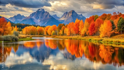 Fototapeta premium Autumnal Serenity A Picturesque River Reflecting Vibrant Fall Foliage Against a Majestic Mountain Range