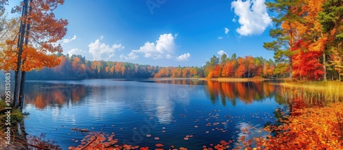 Naklejka premium Autumnal Serenity: A Tranquil Lake Surrounded by Vibrant Foliage