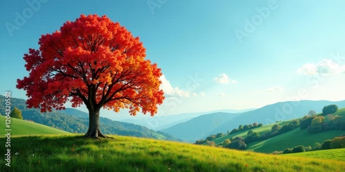 © Vibrant Visions Pixe, Naklejka premium Autumnal splendor A vibrant single tree ablaze with fiery red foliage stands majestically in a verdant meadow, overlooking a serene mountain range bathed in sunlight.