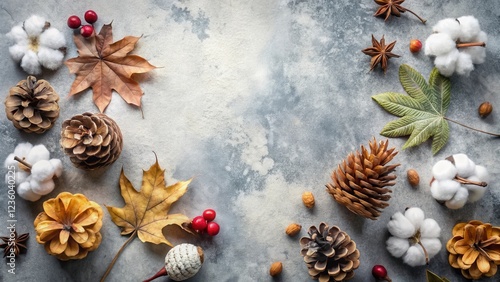 © kavalin, Fototapeta premium Autumnal Still Life with Pine Cones, Cotton, and Leaves on a Grey Background