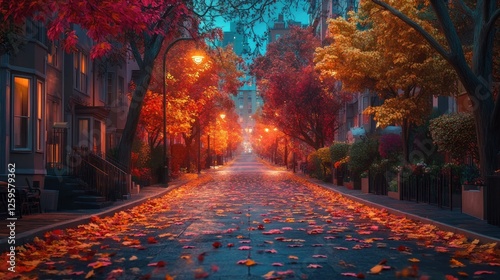 Naklejka premium Autumnal street, city, fall leaves, evening, calm