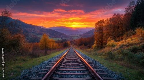© RONNY, Fototapeta premium Autumnal sunset over mountain railway tracks