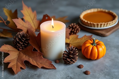 © Rana, Fototapeta premium Autumnal thanksgiving still life with candle pumpkins and pie