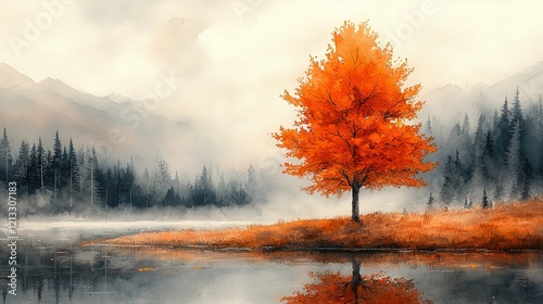 Naklejka premium Autumnal Tree Reflecting in Tranquil Lake Landscape