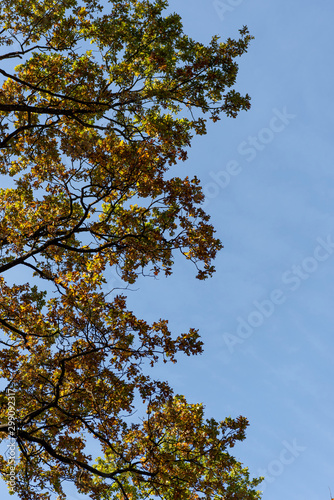Obraz premium autumnal tree with golden foliage on blue sky background in sunlight