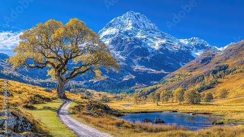 Naklejka premium Autumnal valley path, snow-capped peak, golden leaves