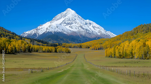 © BROPRADANA, Fototapeta premium Autumnal valley road leading to snowy peak
