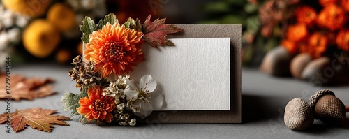 © Georgii, Obraz premium Autumnal white card surrounded by leaves, berries, and chestnuts for festive or seasonal display