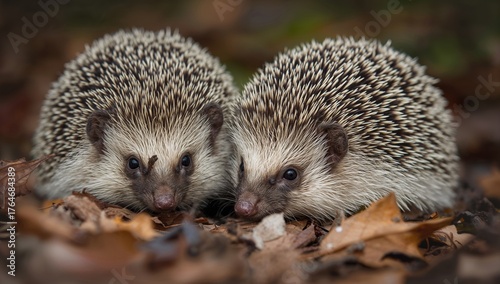 © TheWaterMeloonProjec, Fototapeta premium Autumnal wild hedgehogs observed freely roaming, captured from a concealed wildlife shelter to assess their population and well-being