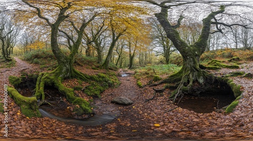 Naklejka premium Autumnal Woodland Path With Mossy Tree Roots And Stream