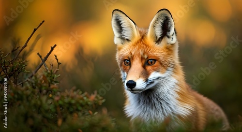 © lamio, Fototapeta premium Autunno, composizione con simpatica volpe in un parco, sfondo con foliage e colori autunnali