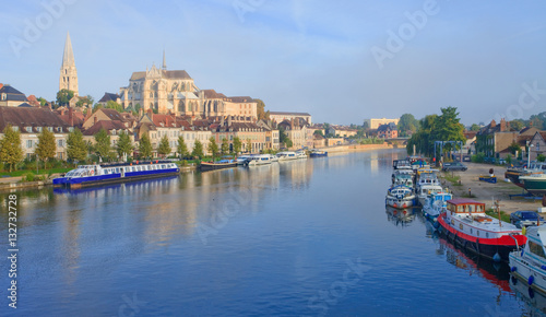 © aterrom, Naklejka premium Auxerre, péniches sur l'Yonne, abbaye Saint-germain, Bourgogne-Franche-Comté