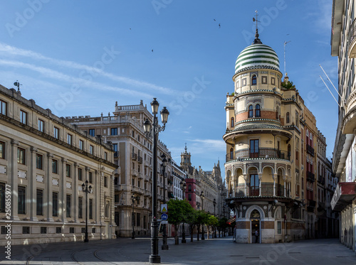 Fototapeta premium „Avenida de la Constitucion” w Sewilli tuż po wschodzie słońca, z piękną...