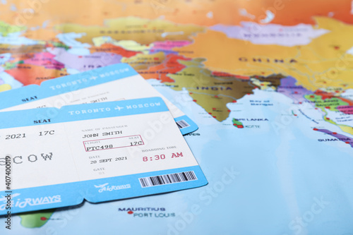 © New Africa, Naklejka premium Avia tickets on world map, closeup. Travel agency concept