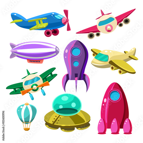 Fototapeta premium Aviation, Airplanes, Space Shuttles, Hot Air Balloons Set