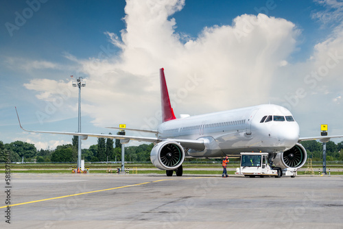 © Antonio, Obraz premium Aviation industry, airplane service at airport field