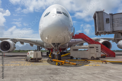 © Unclesam, Fototapeta premium Avion gros-porteur se séparant de sa passerelle d’embarquement