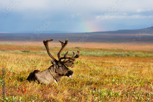 © longtaildog, Fototapeta premium Avka is a general name for domesticated reindeer. Herd of reindeer grazes in the tundra nearby of polar circle.