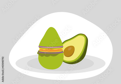 © Mariia, Fototapeta premium Avocado and vegan avocado burger on the plate. Vector illustration.