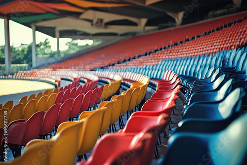 © Kitta Studio, Fototapeta premium Awaiting the Roar: Colorful Stadium Seats Beckon the Crowd
