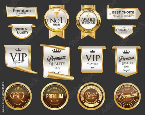 © totallyout, Obraz premium Award Winners medal logo white emblems, badges and laurels collection golden award logo design isolated stock illustration
