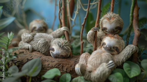 © In-Trend Image, Obraz premium Award Winning national geographic Minimal style, the rule of thirds On the right third of the frame, 3D chubby baby sloths hanging upside down from miniature branches, one baby slo