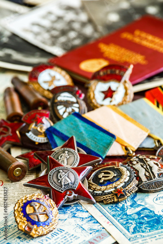 © bukhta79, Fototapeta premium Awards of the Second world war close-up. Soviet military awards - Order Red Banner, Glory,the order of the Patriotic war,Order of the Red Star, Medal for Courage, Medal Battle Merit.