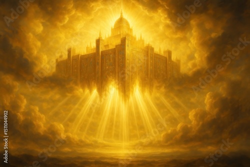 © Bijac, Fototapeta premium Awe inspiring depiction of the New Jerusalem from the Book of Revelation descending from a glorious golden sky a radiant city of divine light and biblical prophecy.