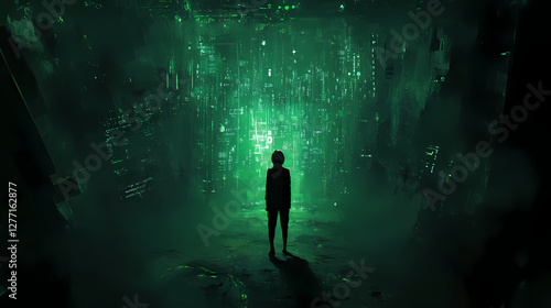 Fototapeta premium Awe-Inspiring Metropolis: A lone figure stands, dwarfed by a futuristic cityscape glowing with neon green. The image encapsulates themes of technology, urban exploration.