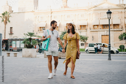 © Roman Tyukin, Naklejka premium Awesome brunette girl in the hat with her boyfriend with beard walking together on the old European street in Spain on the sunset