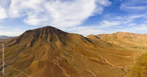 Naklejka premium Awesome high level aspect panoramic view of the dramatic volcanic mountains and rocky landscape in the late afternoon sun on the island of Fuerteventura in the Canary Islands Spain