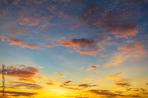 Fototapeta premium Awesome sunset and soft pink clouds of pastel tones. Image template of textured sky. Gorgeous photo wallpaper. Bright epic sky. Dramatic evening light and fiery orange sunset. Beauty of earth.
