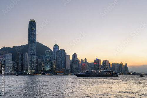 Fototapeta premium Awesome view of cruise ship crossing Victoria harbor at sunset