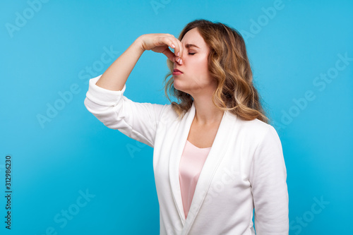 © khosrork, Fototapeta premium Awful smell! Portrait of woman with wavy hair in white jacket pinching her nose, expressing disgust to unpleasant odor, fart gases, her eyes closed with abhor. studio shot isolated on blue background