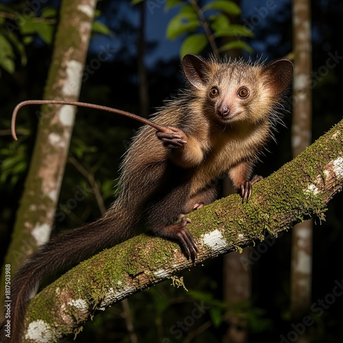 © Canah, Obraz premium Aye Aye Lemur Perched on a Mossy Branch in the Forest.