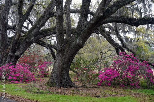 Naklejka premium Azaleas beneath a giant Southern Oak tree