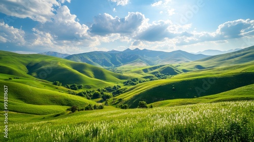 Fototapeta premium Azerbaijan's countryside is stunning, especially on a sunny afternoon in spring. The mountains are beautiful, with rolling green hills and grassy fields. It's a peaceful and picturesque place.