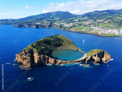 © Iryna, Obraz premium Azores aerial panoranic top view of Islet of Vila Franca do Campo. Crater of old volcano in ocean. San Miguel, Acores, Portugal. Travel concept.