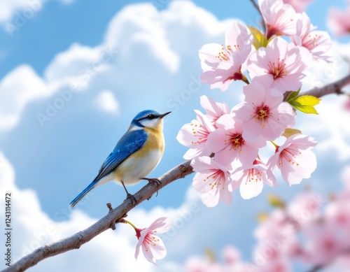 Fototapeta premium Azure bird perched on cherry blossom branch, basking in spring's light