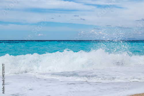 Fototapeta premium Azure breaker waves with white foam hitting shore. Coast of Greek island with blue sky. Sandy beach in Greece. Summer nature travel to Ionian Sea