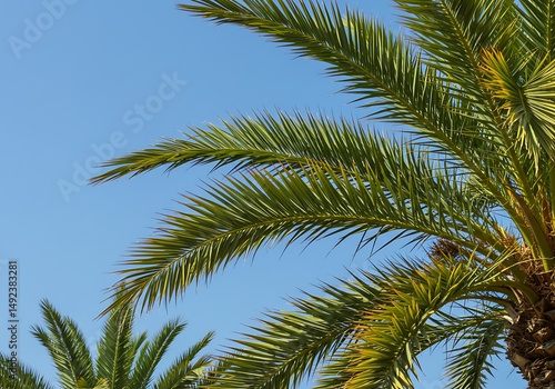 © Matthew, Fototapeta premium Azure Embrace: Palm Fronds & Sky AI Generated
